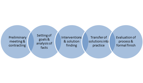 After a preliminary meeting which is free, where we get to know one another and assess whether coaching is the suitable format for your request, we conclude an agreement which specifies the key areas of our cooperation. Following on from this, we will start the process with you describing your situation and specifying your objective(s). Then we get to work by using different methods, where appropriate, ideally leading to a realistic and practical solution. At the end of the process we then assess the extent to which you have achieved your goals, followed by the formal completion of the process. The sequence of the individual coaching process always depends on the concerns to be dealt with and the complexity thereof.